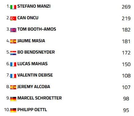 Con il turco giunto al secondo posto nel giorno del suo compleanno, il vantaggio di Manzi in classifica sale a cinquanta punti. Al terzo posto una loro vecchia conoscenza, quel Bo Bendsneyder che mancava dal podio dalla tappa di Assen. Quarto al traguardo Roberto Garcia, che superando Filippo Farioli con una manovra al limite nell'ultimo giro ha rimediato una penalità ed è stato classificato dietro al bergamasco. Ottima prestazione di squadra, dunque, per MV Agusta Reparto Corse, inserita tra le Yamaha della top five.