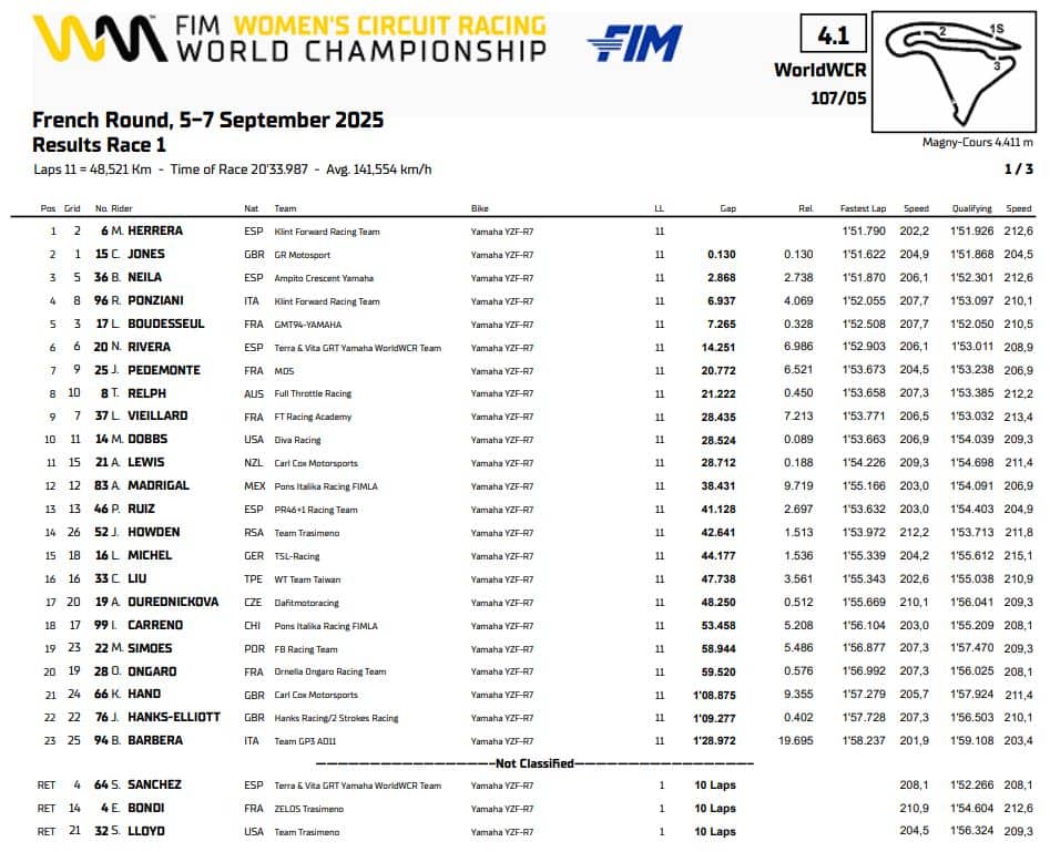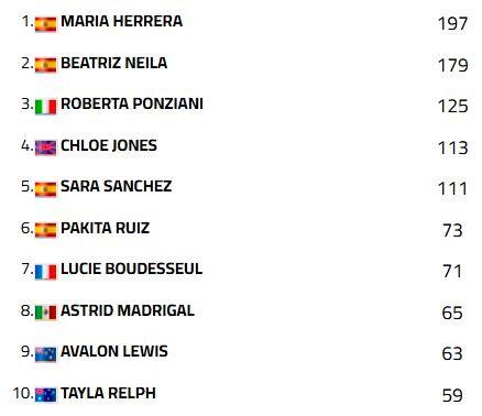Nel WorldWCR arriva la quinta vittoria in stagione per Maria Herrera, in testa fin dai primi metri e mai impensierita dalle inseguitrici. Chloe Jones, infatti, non è mai riuscita a portarle un attacco e si è dovuta accontentare del terzo secondo posto di fila, mentre a chiudere il podio è stata una Beatriz Neila meno brillante che in altre occasioni. Quarta in rimonta Roberta Ponziani davanti a Lucie Boudesseul, mentre il team GRT festeggia il bel sesto posto di Natalia Rivera, ma raccoglie la caduta di Sara Sanchez. Ventitreesima Beatrice Barbera.