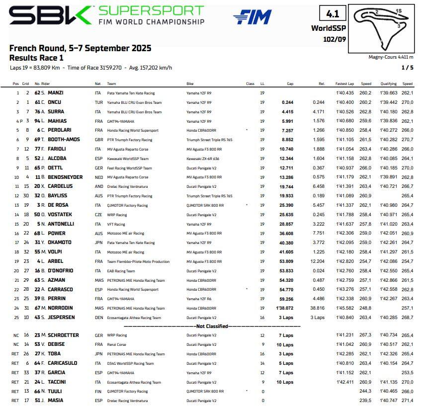 Prima giornata di gare a Magny-Cours per le classi Supersport e il WorldWCR che va in archivio. Partendo dalla middle class, Stefano Manzi si è reso protagonista di un vero capolavoro al termine di una gara di coppia con Can Oncu: al penultimo giro il pilota del team Ten Kate si è salvato da una caduta alla curva tredici, dove gli si è chiuso l'anteriore; Oncu l'ha sfilato (con contatto) e ha preso un margine di circa nove decimi, che l'italiano ha colmato con un giro mostruoso fino a riconquistare la posizione in quella stessa curva, complice un ultimo giro lento del turco.
