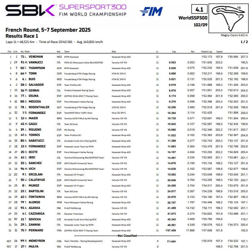 In Supersport 300 una bellissima lotta a tre piloti premia Loris Veneman, che dopo la pole position di ieri corona il ritorno nella categoria con una vittoria. Grande gara di Matteo Vannucci, scattato ventinovesimo e beffato per la vittoria solo all'ultima curva. Il pilota di Bagno a Ripoli torna sul podio per la prima volta da Aragon 2023, tenendosi dietro l'arrembrante Carter Thompson. Philipp Tonn è quarto al rientro da un infortunio, subito davanti al compagno di squadra Jeffrey Buis. A punti Mirko Gennai (settimo) e Marco Gaggi (tredicesimo).