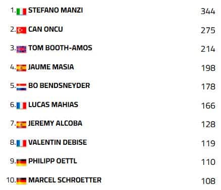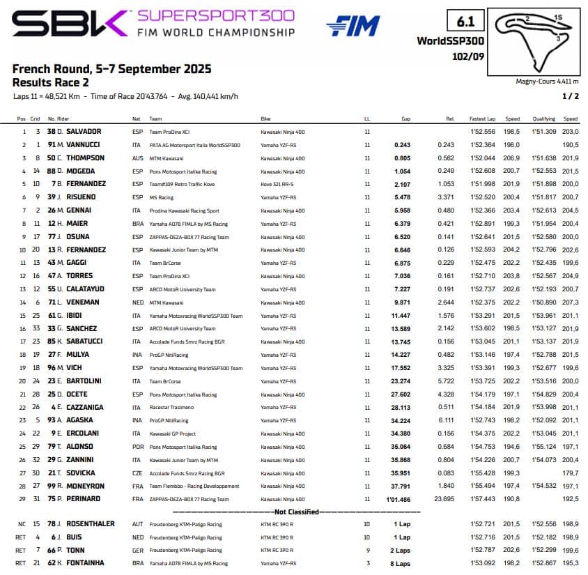 In Supersport 300 arriva il primo successo stagionale di David Salvador, che porta la Kawasaki del team ProDina in cima al podio. Nuovamente secondo Matteo Vannucci, bravo a districarsi in una gara di gruppo così come Carter Thompson, che replica il terzo posto di ieri. Quarta posizione per Daniel Mogeda seguito dal leader di campionato Benat Fernandez, che allunga in classifica e sale a undici punti di vantaggio su Salvador. Caduta all’ultimo giro per Jeffrey Buis, che coinvolge Loris Veneman. A punti Mirko Gennai (settimo), Marco Gaggi (undicesimo) e Gianmaria Ibidi (quindicesimo).