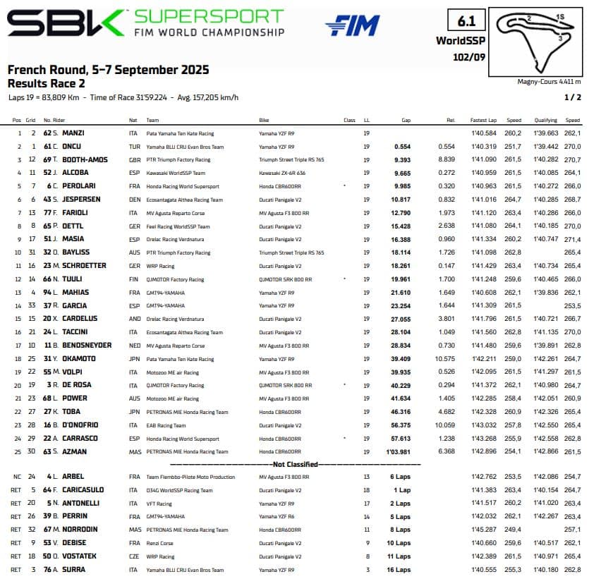 Due capolavori in due gare per Stefano Manzi a Magny-Cours, l’ennesima prova di forza del pilota più forte della classe Supersport. Dopo il prodigioso recupero all’ultimo giro nella corsa del sabato, nell’ultimo terzo di Gara 2 l’italiano ha ricucito un gap di oltre tre secondi da Can Oncu, accumulato dopo l’highside di Alberto Surra davanti a lui. Questo forcing gli ha permesso di attaccare all’ultimo giro, alla variante Imola, senza lasciare scampo al rivale turco. Per Manzi è la nona vittoria in stagione e il suo margine in classifica sale a sessantanove punti. Yamaha conquista con tre tappe di anticipo il campionato costruttori. Doppia seconda posizione dunque per Oncu, mentre con la caduta di Surra nelle prime fasi si è aperta la caccia al terzo posto. A spuntarla è stato Tom Booth-Amos su Triumph, davanti a Jeremy Alcoba (al miglior risultato in stagione con la Kawasaki Ninja 636) e a Corentin Perolari, ancora quinto e primo nel Challenge europeo. Buona prestazione per Simon Jespersen, sesto, seguito da Filippo Farioli; top ten chiusa da Philipp Oettl, Jaume Masià e Oliver Bayliss.