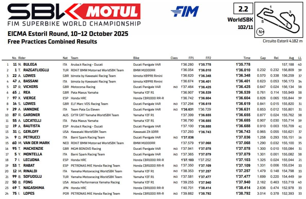 I due mattatori del campionato non sembrano voler lasciare scampo nemmeno in questo undicesimo appuntamento stagionale, ma alle loro spalle sono emerse le Bimota di Alex Lowes e Axel Bassani, terzo e quarto nella combinata con due sessioni sempre in top five. A trovare quella top five, in maniera inaspettata, è stato poi Ryan Vickers. Nel giorno dell’annuncio della rescissione del suo contratto con Motocorsa Racing, l’inglese ha stampato un paio di bei giri e si è messo davanti a un nome altisonante come Jonathan Rea. Settima posizione per Xavi Vierge, che di Rea prenderà il posto in Yamaha nel 2026, poi le Ducati di Sam Lowes e Andrea Iannone.
