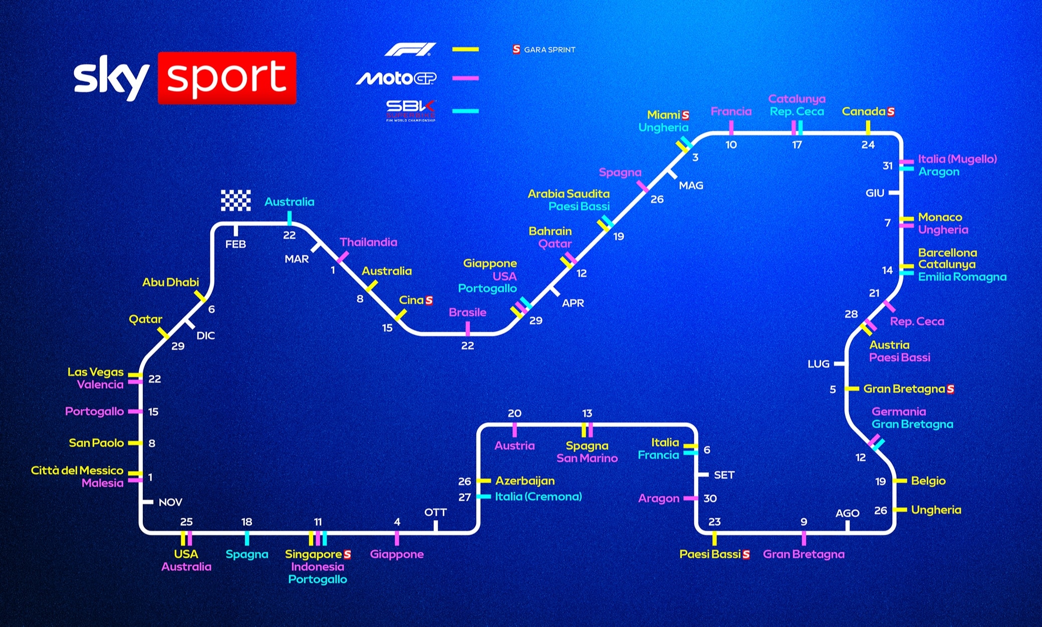 La prossima settimana parte la MotoGP, con tutti i Gran Premi live in esclusiva su Sky e in streaming solo su NOW fino al 2027. Appuntamento il 1° marzo sul circuito di Buriram, in Thailandia, per il primo dei 22 GP, 6 dei quali in diretta anche su TV8: Qatar, Francia, Italia, Germania, San Marino-Misano e Portogallo. Terzo anno per il formato con la Sprint Race al sabato (tutte in diretta su TV8) con il campionato che si concluderà a Valencia il 22 novembre. Durante la stagione in pista anche i campionati di Moto2 e Moto3.