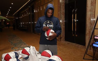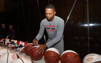Eric Gordon impegnato con i palloni da autografare: una sorta di riscaldamento anche questo -