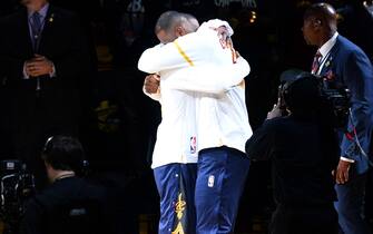 L'abbraccio tra le due stelle della squadra, Kyrie Irving e LeBron James. Il pubblico ha intonato il coro "Mvp!" in onore del suo numero 23 -