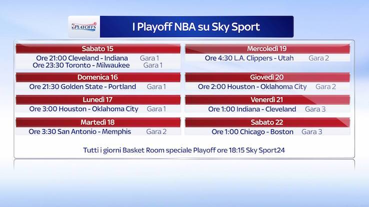 Ecco tutti gli appuntamenti televisi in palinsesto sui canali di Sky Sport per la prima settimana di playoff. Nove partite in sette giorni: un'abbuffata di pallacanestro per festeggiare l'inizio della corsa verso il titolo NBA