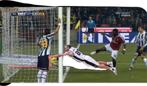 Anche su quello che ancora oggi è uno dei casi arbitrali legati al calcio più discussi degli ultimi anni, spunta il braccio e la manona del playmaker argentino: via Buffon e dentro lui, la parata sul colpo di testa di Muntari è sua!