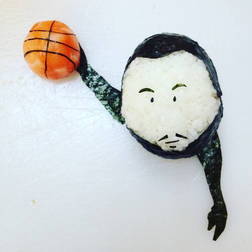 Lo chef Yujia Hu nel corso dell'ultimo anno ha ricreato i volti dei principali giocatori NBA e delle loro scarpe utilizzando il sushi. Ecco le sue creazioni! La nostra intervista - VIDEO: Come si crea un onigiri a forma di Manu Ginobili - Account Instagram - Sito Internet