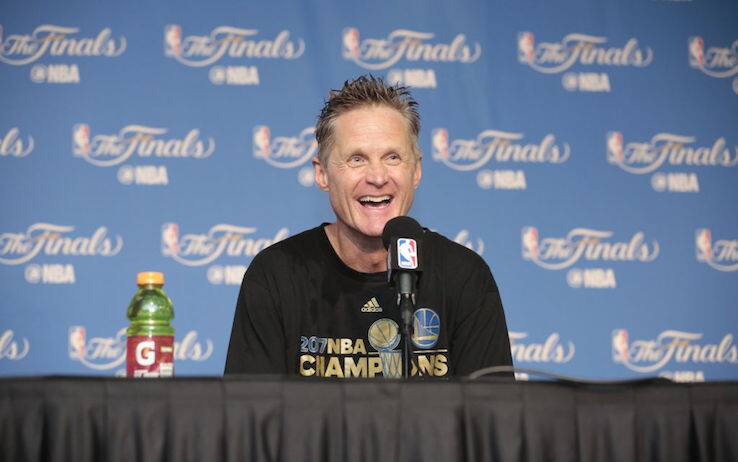 OAKLAND — Quando i Golden State Warriors sono festanti sul palco in mezzo al campo, il Larry O’Brien Trophy pronto per essere alzato, e sul jumbotron della Oracle Arena viene inquadrato il volto — visibilmente commosso — di Steve Kerr, il pubblico della Dub Nation (come sono chiamati qui i tifosi degli Warriors) reagisce con uno dei boati più assordanti della serata. Questo titolo NBA è ovviamente del solito Steph Curry, è dell’MVP Kevin Durant, è di un incredibile Klay Thompson, del matto Draymond Green e dell’eterno Andre Iguodala, ma in maniera del tutto speciale è anche (e forse prima ancora) il titolo di Steve Kerr. La stagione più travagliata della sua carriera — e forse della sua vita — finisce con il secondo titolo NBA da capoallenatore (dopo cinque vinti da giocatore), ricompensa meritatissima: “Vincere è sempre fantastico e io ho avuto la fortuna di far parte di tante squadre vincenti ma stasera è un po’ diverso, per via di tutto quello che ho dovuto sopportare”, ammette l’allenatore di Golden State, alle prese con guai fisici tutt’altro che risolti che lo hanno a lungo tenuto lontano dalla panchina durante questi playoff. “Voglio prima di tutto congratularmi con i Cleveland Cavs, un fantastico gruppo di giocatori: l’anno scorso ci hanno spezzato il cuore, questa volta è stato il nostro turno. Siamo ovviamente felici, e lo potete intuire dai miei capelli bagnati…”, scherza, riferendosi alla consueta doccia di champagne appena subita in spogliatoio.