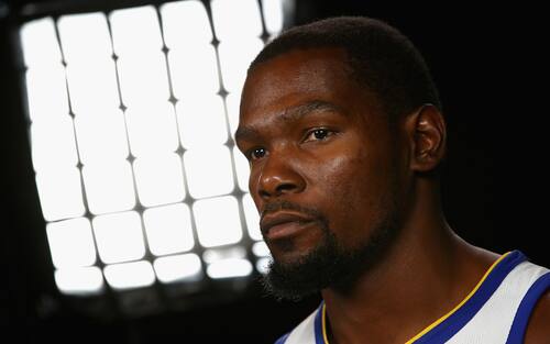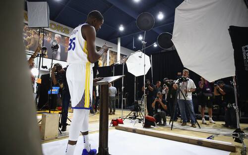 KEVIN DURANT | Mille le incombenze per le superstar degli Warriors durante il classico Media Day che dà il via alla nuova stagione. Qui KD si mette in posa per lo scatto giusto.