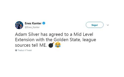 ENES KANTER | Adam Silver ha trovato l'accordo per una mid level extension con i Golden State Warriors, fonti interne alla lega MI dicono