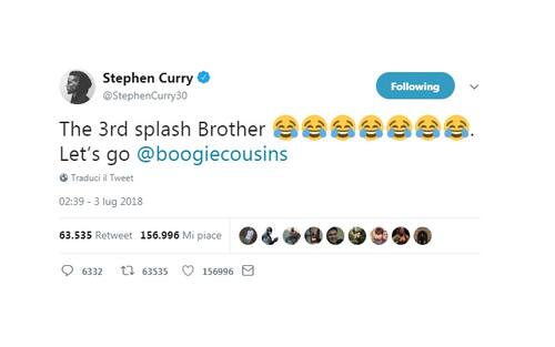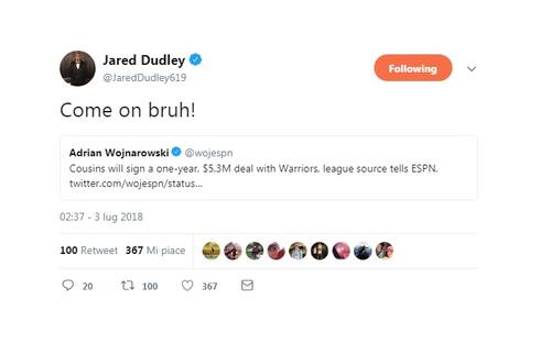 Il colpo di mercato dei campioni NBA in carica – che per 5.3 milioni di dollari mettono sotto contratto per il prossimo anno un due volte All-Star come DeMarcus Cousins – non lascia indifferente futuri compagni di squadra e avversari. Che da tradizione affidano le loro reazioni (per la maggior parte di sorpresa) a Twitter. E non mancano grandi dosi di ironia e una vena polemica