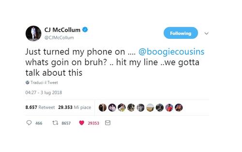 C.J. McCOLLUM | Ho appena acceso il mio telefono... @boogiecousins cosa stai combinando, fratello? ... Chiamami... Dobbiamo parlare di questa cosa