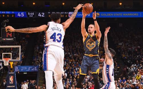 10/18 da tre vs. PHILADELPHIA 76ERS, 31 gennaio 2019 | La seconda sconfitta di Golden State quando Curry realizza almeno 10 triple (11-2) arriva in casa contro i Sixers, nonostante i 41 punti del loro All-Star.