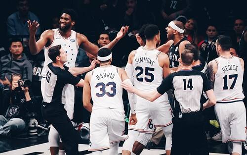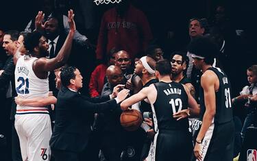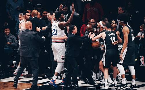 Nel terzo quarto un fallo duro di Joel Embiid su Jarrett Allen scatena un parapiglia che coinvolge diversi giocatori di Nets e Sixers. Jared Dudley mette le mani addosso a Embiid e poi viene spinto fuori dal campo da Jimmy Butler. I due vengono espulsi, mentre Embiid se la cava con un flagrant foul. Tutte le immagini della rissa
