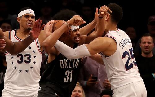 Anche Jarrett Allen rimane coinvolto nella rissa, tra Tobias Harris e Ben Simmons