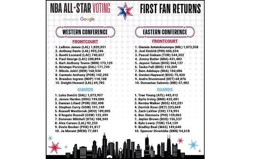 I primi risultati nella corsa a una maglia da All-Star da indossare nella partita delle stelle del prossimo 16 febbraio a Chicago, ha confermato quanto già ipotizzato da molti: Luka Doncic e Giannis Antetokounmpo sono il presente e non solo il futuro della NBA, i più amati dal pubblico. Quelli che hanno raccolto più voti di tutti, superando anche LeBron James per numero totale. Dietro di loro tanti nomi eccellenti e qualche beniamino degli appassionati spuntato fuori a sorpresa: ecco la lista completa dei nomi, in ordine di ruolo e di conference