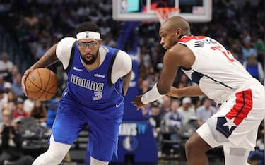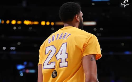 Anthony Davis con la maglia numero 24 di Kobe Bryant durante il riscaldamento dei Lakers prima della palla a due contro Portland
