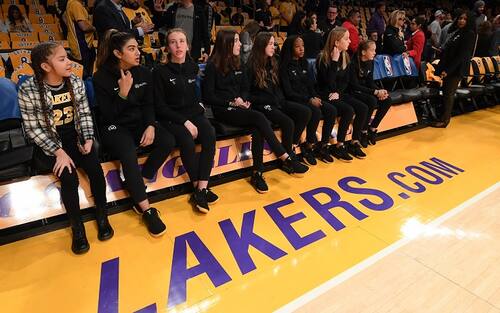 Le compagne di squadra di Gigi Bryant alla Mamba Sports Academy hanno seguito il riscaldamento delle squadre a bordo campo