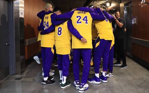 L'abbraccio collettivo dei giocatori dei Lakers - tutti con addosso la maglia di Kobe - prima dell'ingresso in campo per il riscaldamento