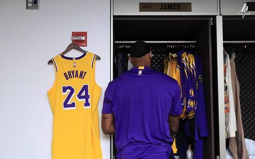 L'angolo di LeBron James in spogliatoio, con la maglia numero 24 di Kobe Bryant al suo fianco mentre si prepara prima della della palla a due