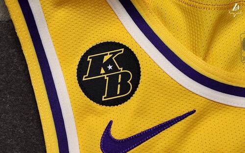 Un dettaglio della maglia che i Lakers hanno indossato nella partita contro Portland, con il logo che riporta le iniziali KB in onore del Black Mamba