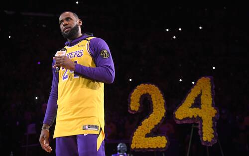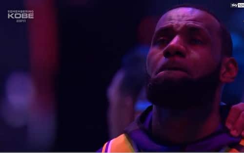 Le lacrime di LeBron James durante l'inno nazionale, a seguito di 10 minuti in cui i Lakers hanno ricordato l'importanza di Kobe Bryant nella storia dei Lakers e della pallacanestro