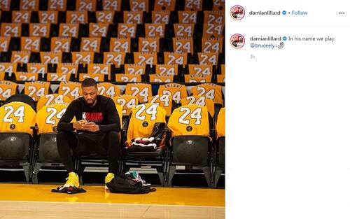 Il post su Instagram di Damian Lillard all'interno dello Staples Center per la sessione di tiro: "Giocamo nel segno del suo nome"