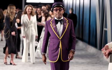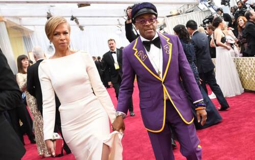 Spike Lee sul red carpet del Dolby Theatre di Los Angeles insieme con la moglie Tonya. Nella notte degli Oscar 2020, l'attore e regista statunitense ha voluto omaggiare Kobe Bryant con un completo gialloviola, i colori simbolo dei Lakers