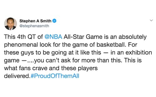 Anche i volti televisivi sono stati concordi nell'applaudire il nuovo formato: "Il quarto periodo dell'All-Star Game è stato fenomenale per il gioco della pallacanestro. I ragazzi ci hanno dato dentro anche in una partita di esibizione, non si può chiedere nulla di più. È quello che i fan vogliono, e i giocatori glielo hanno dato. #Orgogliosoditutti" ha scritto Stephen A. Smith di ESPN
