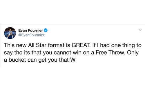 "Il nuovo formato dell'All-Star Game è BELLISSIMO. Se potessi cambiare una cosa, direi che non si può vincere con un tiro libero. Solo un canestro può darti la vittoria" è il cambiamento che farebbe Evan Fournier di Orlando