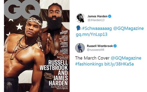 LA COVER DI GQ | “Il duo più ‘stiloso’ della NBA”. Così la nuova copertina del mensile GQ definisce Russell Westbrook e James Harden, i nuovi protagonisti in prima pagina. Sullo sfondo di una bandiera USA a stelle e strisce in versione bianco&nero, le due superstar dei Rockets concedono una lunga intervista al giornalista Mark Anthony Green che contiene parecchi passaggi interessanti. Li riassumiamo qui di seguito