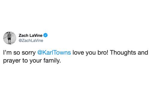 La notizia della scomparsa di Jackie Towns per complicazioni legate al coronavirus ha colpito duramente il resto della NBA, che si è stretta attorno a Karl-Anthony — uno dei giocatori più popolari della lega. Da veterani come Steph Curry e Paul a ex compagno come Zach LaVine, tantissimi hanno voluto far sentire la loro vicinanza a KAT