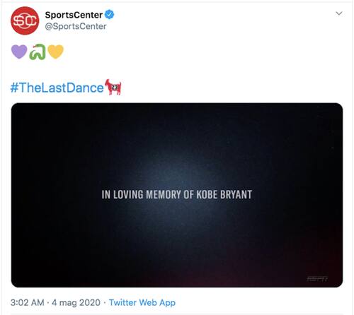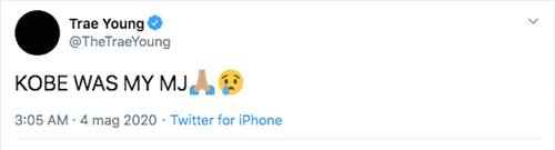 Particolarmente toccante il messaggio di Trae Young, che di fronte alle immagini di un Kobe che parla di Jordan come di un suo fratello maggiore dal quale trarre ispirazione e consigli, sottolinea: "Kobe era il mio Jordan", il suo esempio, il suo mentore, il suo idolo