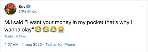 Kevin Knox invece sottolinea il commento di Jordan in risposta ad alcuni compagni che preferivano giocare e sfidare senza puntare grosse cifre. Una volta MJ chiese loro di prendere parte alla partita e sottolineando il fatto che la posta in palio fosse soltanto un dollaro, il n°23 dei Bulls rispose: "Non mi interessa: il motivo per cui voglio giocare è mettermi i tuoi soldi nel mio portafoglio"