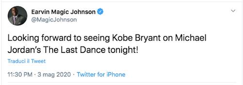Magic Johnson, anche lui presente in alcuni passaggi delle due nuove puntate di "The Last Dance", non vede l'ora che inizi lo spettacolo - sottolineando uno dei passaggi chiave dei due episodi, le parole dedicate da Kobe Bryant a Jordan