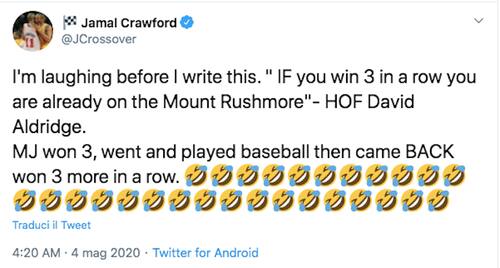 Jamal Crawford è un altro di quelli che non perde neanche una puntata della serie: "Un Hall of Famer come David Aldridge sottoliea che se vinci 3 titoli in fila diventi una leggenda. Beh, MJ ne ha vinti 3, è andato a giocare a baseball, è tornato e ne ha conquistati altri tre"