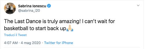 Anche Sabrina Ionescu, la prima scelta all'ultima Draft WNBA, sottolinea la bellezza del documentario su Jordan e la voglia di ritornare in campo a giocare e allenarsi più forte di prima