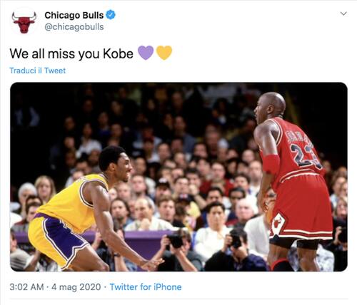 La dedica dell'account ufficiale dei Chicago Bulls è il pensiero che accompagna tutto il mondo della pallacanestro da oltre tre mesi: "Ci manchi Kobe"