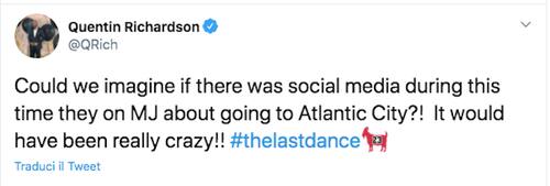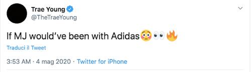 Altro passaggio importante del racconto è quello dedicato all'accordo con Nike raggiunto da Jordan, nonostante all'inizio il n°23 dei Bulls non fosse propenso verso quel marchio: "Pensate se MJ avesse firmato con Adidas", il commento con tanto di faccina stupita di Trae Young