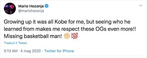 La chiosa di Mario Hezonja è sempre dedicata a Bryant: "Sono cresciuto seguendo l'esempio di Kobe, ma vedendo da chi lui ha imparato mi porta ad avere ancora più rispetto nei suoi confronti! Quando mi manca la pallacanestro!". Non solo a te Mario, non solo a te