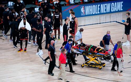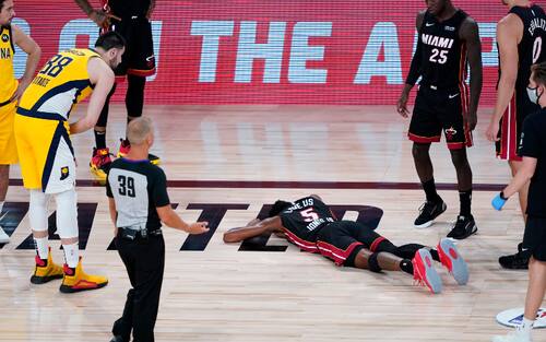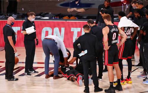 Questa l'immagine che più di tutte ha colpito (e fatto spaventare) i tifosi degli Heat e tutti gli appassionati NBA: Derrick Jones Jr. a terra, andato a sbattare in maniera durissima contro il blocco portato da Goga Bitadze - crollato a terra senza che nessuno riuscisse ad avvicinarsi per paura di toccare o compiere qualche gesto sbagliato