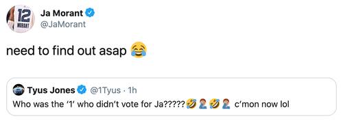 Se la vittoria di Morant non fa così notizia, forse qualcuno ha storto il naso per quel singolo voto andato a Williamson che ha tolto l'unanimità al premio del giovane dei Memphis Grizzlies. il compagno Tyus Jones ha chiesto chi fosse quello che non ha votato per Morant, e il diretto interessato ha scritto "devo scoprirlo al più presto"