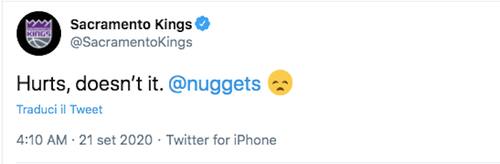 La pagina ufficiale dei Sacramento Kings tagga quella dei Nuggets, sottolineando il duro colpo subito dopo un canestro del genere. Quello di Robert Horry del 2002 è rimasto ben impresso nella mente dei tifosi californiani...