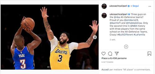 JOHN CALIPARI SU ANTHONY DAVIS | Anche del giocatore originario di Chicago il coach di Kentucky ricorda la sua apparizione nei quintetti difensivi della lega (nel suo caso il primo), per un giocatore che peraltro ha chiuso la stagione regolare al 6° posto (con 82 punti) anche nella classifica per il premio di MVP. "Orgoglioso di te", scrive su Instagram