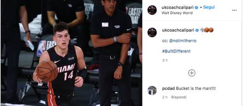 JOHN CALIPARI SU TYLER HERRO | Solo emoticon da parte del suo ex allenatore per commentare le straordinarie prestazioni ai playoff della guardia dei Miami Heat, un giocatore che non a caso ha scelto come nick su Instagram un eloquente "nolimitherro", senza limiti. Per lui coach Cal propone l'hashtag #BuiltDifferent, perchè i giocatori di Kentucky sembrano proprio costruiti a modo loro, in maniera diversa dagli altri