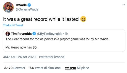 IL COMMENTO DI DWYANE WADE | Presentissimo su Twitter lungo tutto l'arco di una gara-4 evidentemente vissuta con il cuore in gola, l'ex leggenda degli Heat ha commentato col più classico dei "È stato bello finché è durato" l'impresa che ha visto il rookie di Miami strappare proprio a Wade il record per marcature in una gara di playoff da matricola nella storia degli Heat