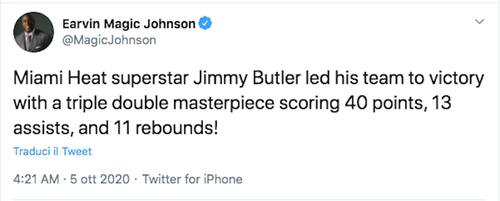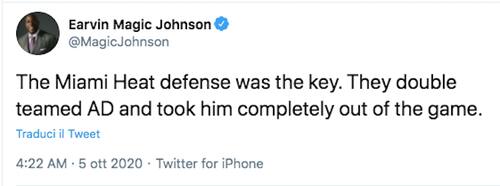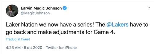 Il solito tweet "istituzionale" di Magic Johnson: anche la fredda cronaca non può che fare male a un tifoso Lakers come lui