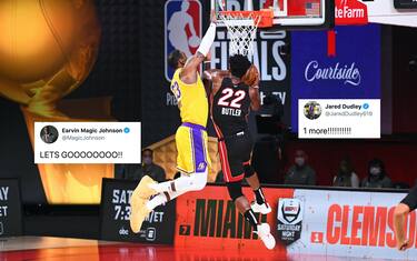 Anche il resto della NBA si è piazzato sul divano per godersi gara-4 tra i Lakers e gli Heat. Dalla gioia di Magic Johnson al tweet di Jared Dudley direttamente dallo spogliatoio fino al “silenzio” di Dwyane Wade, ecco le reazioni sui social alla vittoria dei gialloviola che ora sono a un passo dal titolo